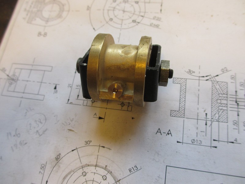 et l'ébauche tournée du tiroir, dans un bout de bronze d'origine inconnue, mais superdur. Le fraisage sur mon petit tour toyo est supercoton...la machine souffre un max, mais je suis sans pitié. je prévois une fonderie (bronze, laiton si possible, sinon zamac) pour les bielles, pour changer. Je ne me vois pas les usiner dans du bronze massif encore sur ce minitour, et tous ces assemblages mécanosoudés me gonflent !