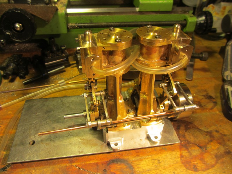 J'ai monté toutes les pièces, et après quelques ajustements (les écrous presse-étoupes qui touchent la chape du tiroir par ex, ou les fentes un peu serrées), tout va bien, ça tourne parfaitement, et démarre d'un souffle d'air.