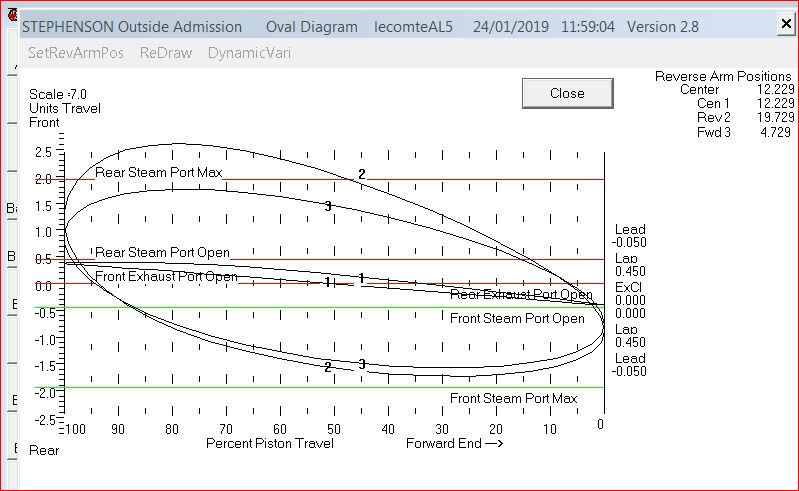 Par contre, la suspension de la coulisse au milieu de celle-ci plutôt qu'à une extrémité (comme sur la plupart des machines marines) donne une distribution de vapeur bien plus symétrique pour les 2 sens de marche comme on peu voir sur la modélisation des distributions vapeur de ces 2 moteurs avec le diagramme en ovale : le déplacement du tiroir en fonction de la position du piston, suivant les 2 sens de marche et la coulisse au centre.