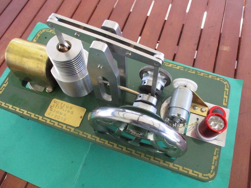 retour a l'usinage avec un stirling à balancier ,d'apres les plans de jcma ,j'espere lui faire entrainer un moteur electrique pour allumer une ampoule :roll: le socle et le volant proviennent d'une machine à coudre :)