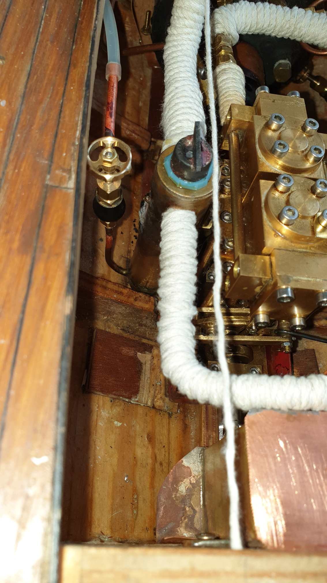 voilà ce que ça donne : l'echappement vapeur etait prévu dans la cheminée pour faire un beau panache (et effectivement joli...) mais l'efficacité relative du deshuileur et la production d'eau transformait la chaudière en cafetière l'eau se revaporisait dans la cheminée et après un petit arrèt de 2 mn à la remise en marche l'eau et l'huile sont ressorties par les prise d'air du bruleur ... donc refonte du système (sur la photo c'est l'ancien) et réutilisation du tuyau de sortie vapeur au niveau de la coque que le proprio précedent avait bouché avec un rond de laiton de plus d'1 cm de long !! facile à repercer !