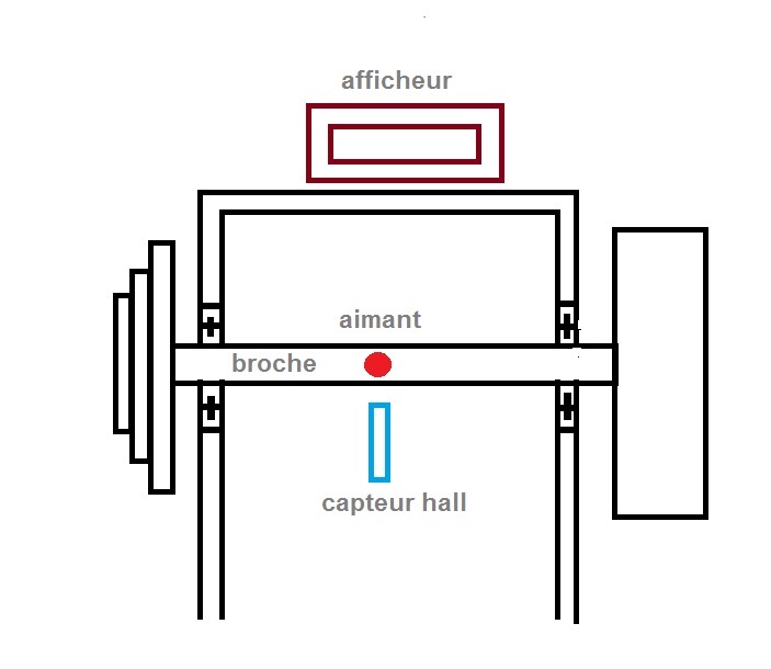 J’ai monté (collé) l’aimant sur la broche du tour et le capteur Hall sur une patte en regard de l’aimant (5mm) Après avoir alimenté tout le bazar, je n’ai aucune info qui arrive sur le tachymètre (???).