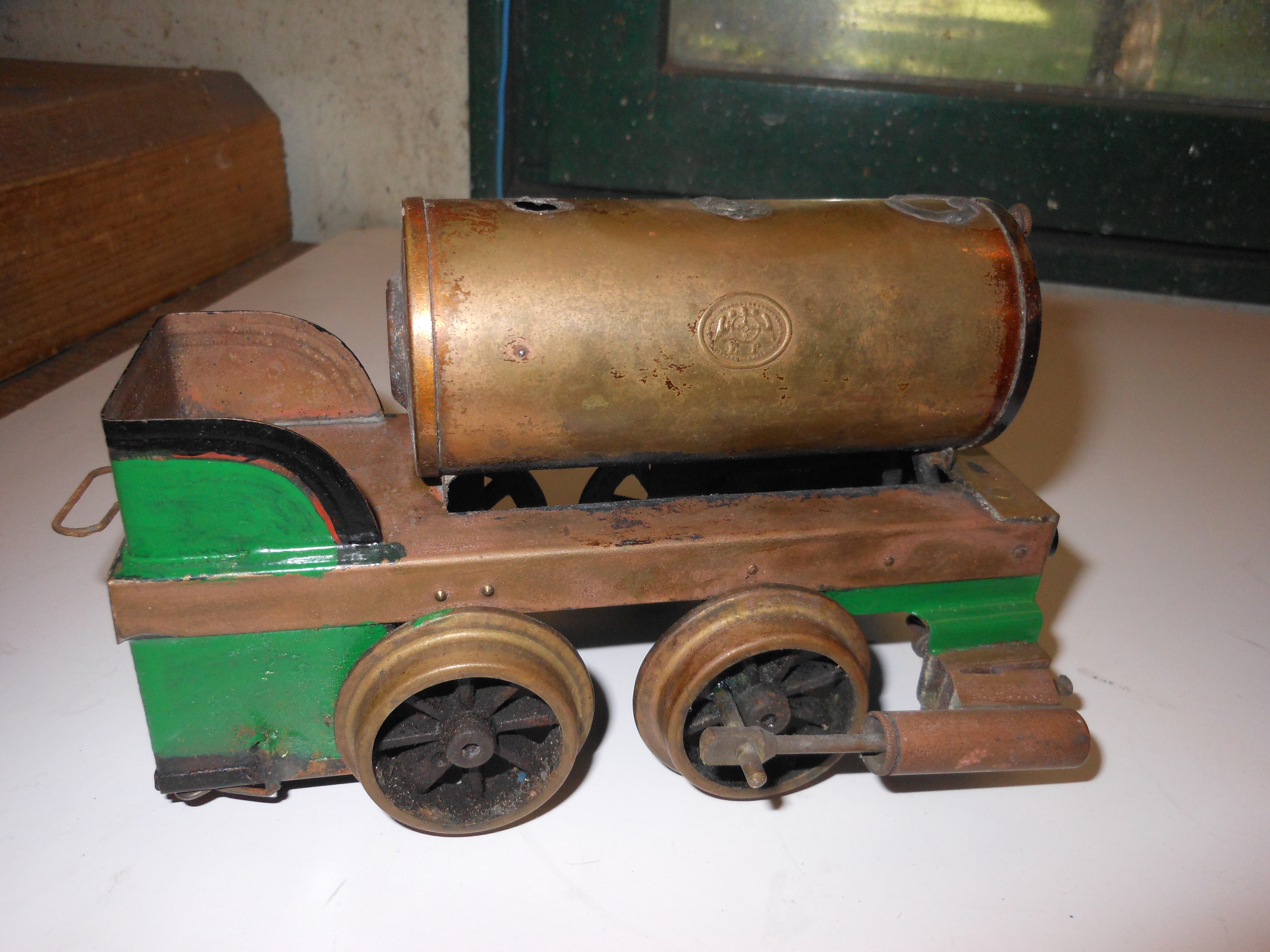 Et enfiler un tuyau souple par la virole du sifflet et envoyer de l'air avec un coup de pompe à vélo, si les cylindres et les roues montrent des signes de vie, il faut envisager une réparation, sinon, il suffit d'astiquer le laiton et de la laisser sur l'étagère, et bien sûr refaire une machine neuve de novo...