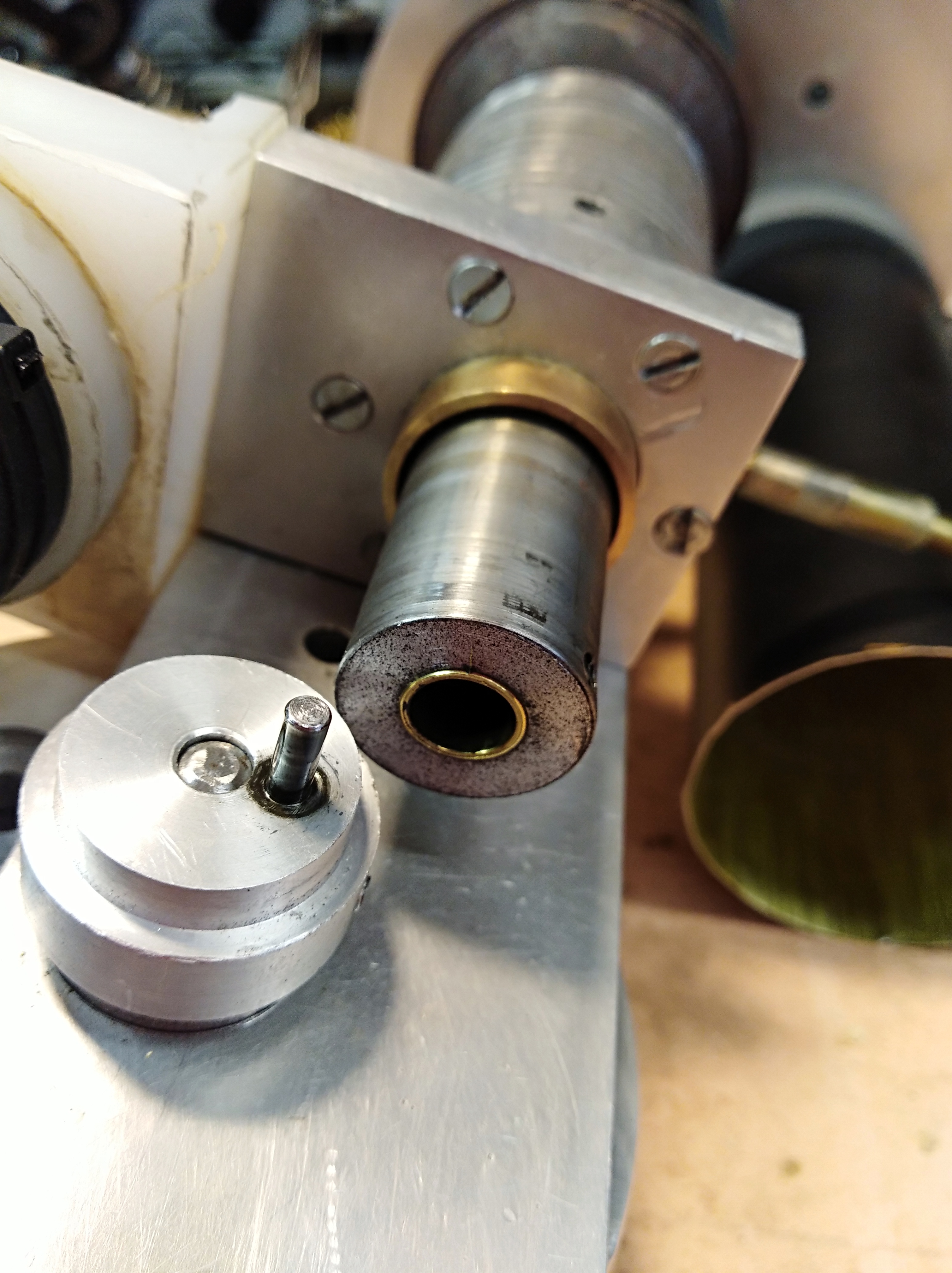 Le cylindre de 8mm en laiton qui est solidaire du piston principal forme avec le cylindre central de 8mm solidaire du déplaceur un ensemble piston cylindre qui réagit à la différence de pression entre la pression atmosphérique et la pression interne dans le moteur (le cylindre de 8mm coté piston est relié à l'air libre: (à voir au sommet de la tête du piston). Dans la phase de compression (le piston principal descend), le petit piston (8mm) pousse le déplaceur (1,2 atm > 1 atm) vers le haut. Par contre dans la phase de détente, le petit piston aspire le déplaceur vers le bas (0,8atm < 1atm). C'est par l'intermédiaire des 2 petits cylindres de 8 mm coulissants (et guidants) que le déphasage entre piston - déplaceur est effectué. Dans ce moteur je pense que l'on pourrait diminuer le diamètre du petit piston de 8 à 7mm pour emprunter moins d'énergie (de force) au moteur pour actionner le déplaceur (amélioration du déphasage et choc moins important).