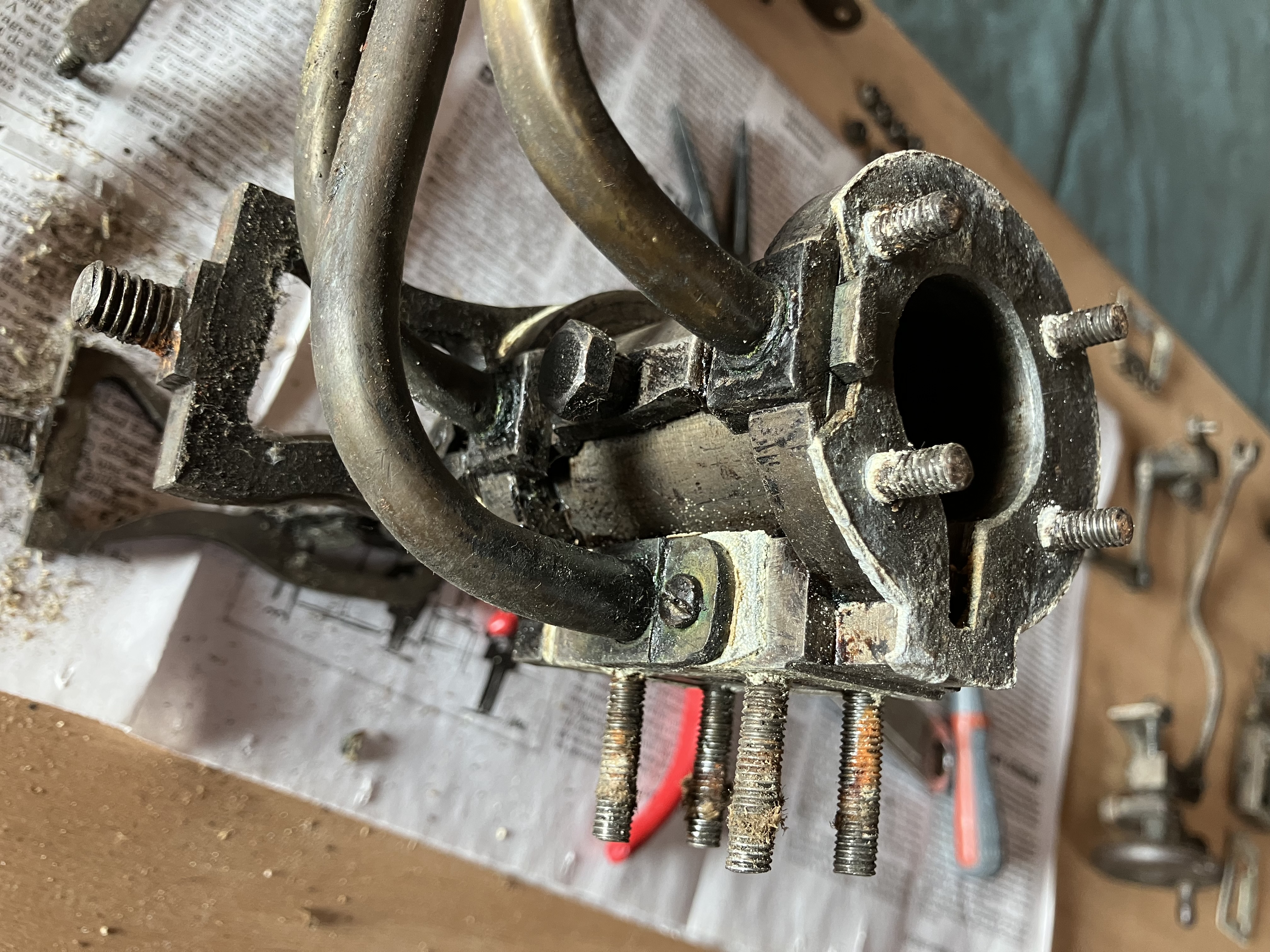 mais surtout ce polissage énergique arrondit trop les arêtes, ce n'est pas joli, ce serait dommage sur ces pièces acier bien usinées à la main; de même pour la rouille et la patine du bronze, doucement, ne pas remettre à neuf, une brosse métal en forme de brosse à dents va aussi. Bon, c'est juste mon avis...pour que ça ne ressemble pas à une machine achetée sur Aliexpress.