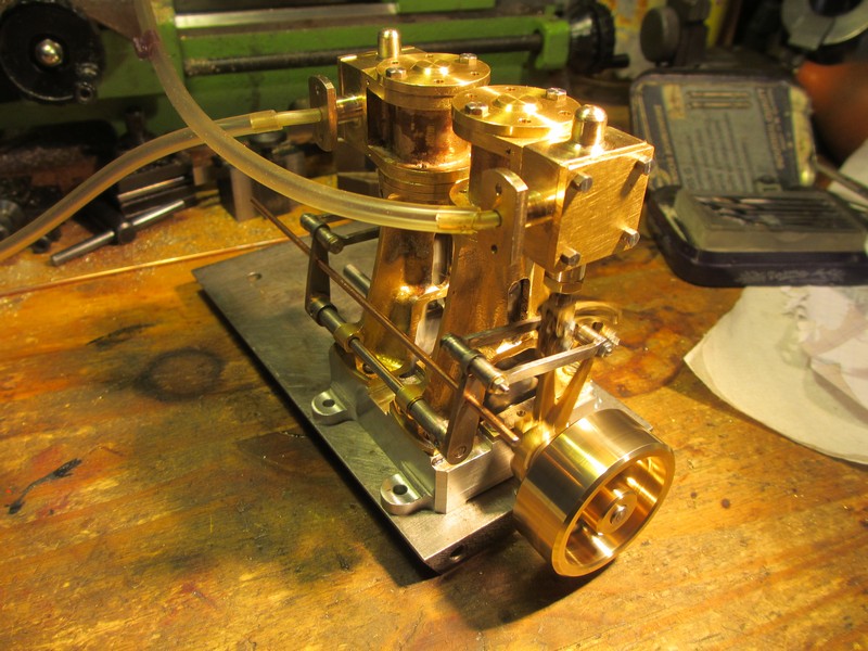 J'ai monté toutes les pièces, et après quelques ajustements (les écrous presse-étoupes qui touchent la chape du tiroir par ex, ou les fentes un peu serrées), tout va bien, ça tourne parfaitement, et démarre d'un souffle d'air.