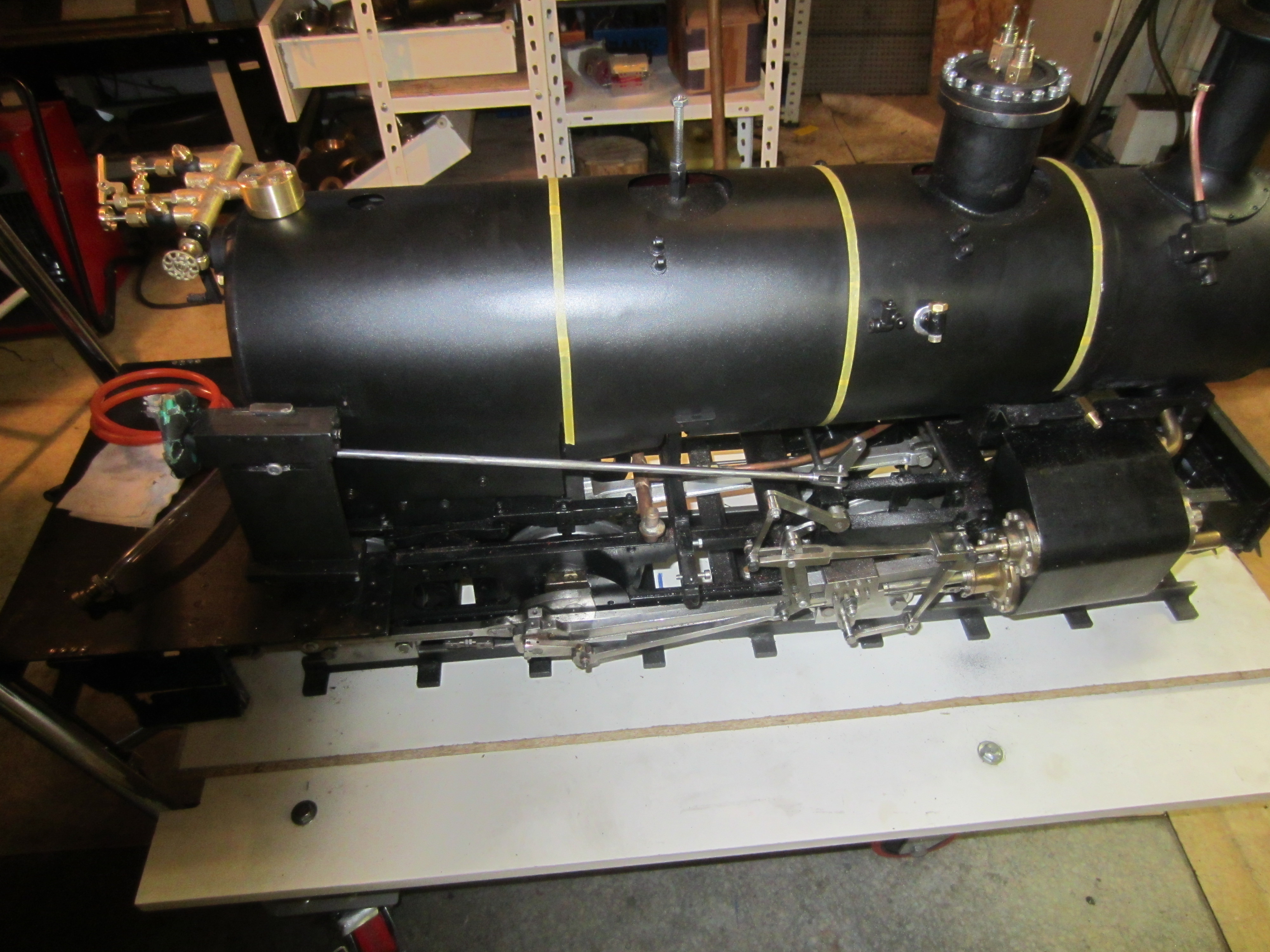 un peu de peinture la loco debout sur ses rouleaux , les marques jaunes sont des guides pour les cerclages., je travaille sur l'étancheité , il y a plein de joints...