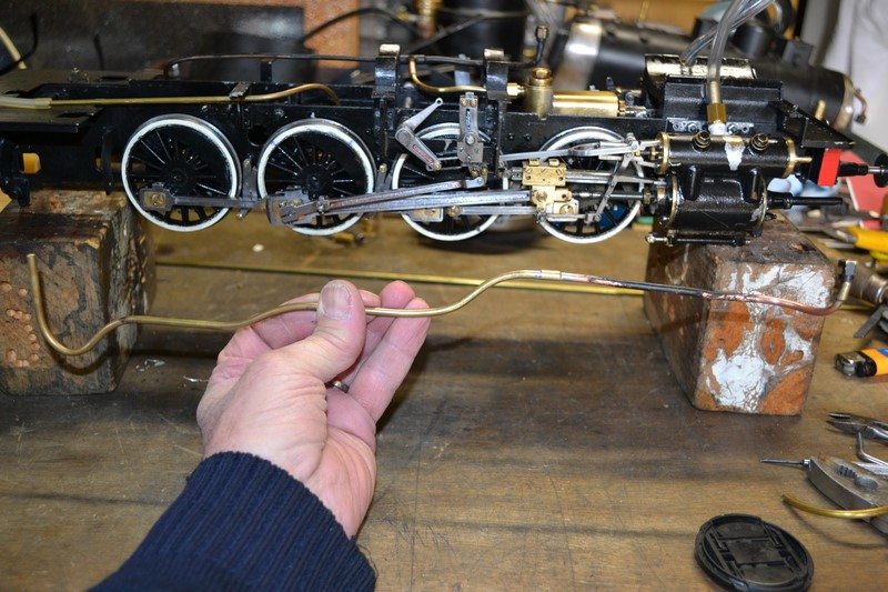 l'alimentation de la chaudière par la pompe à eau du tender nécessite un exercice de plomberie assez tortueux car les passages possibles sont rares compte tenu du foyer crampton qui occupe tout l'espace entre les longerons.