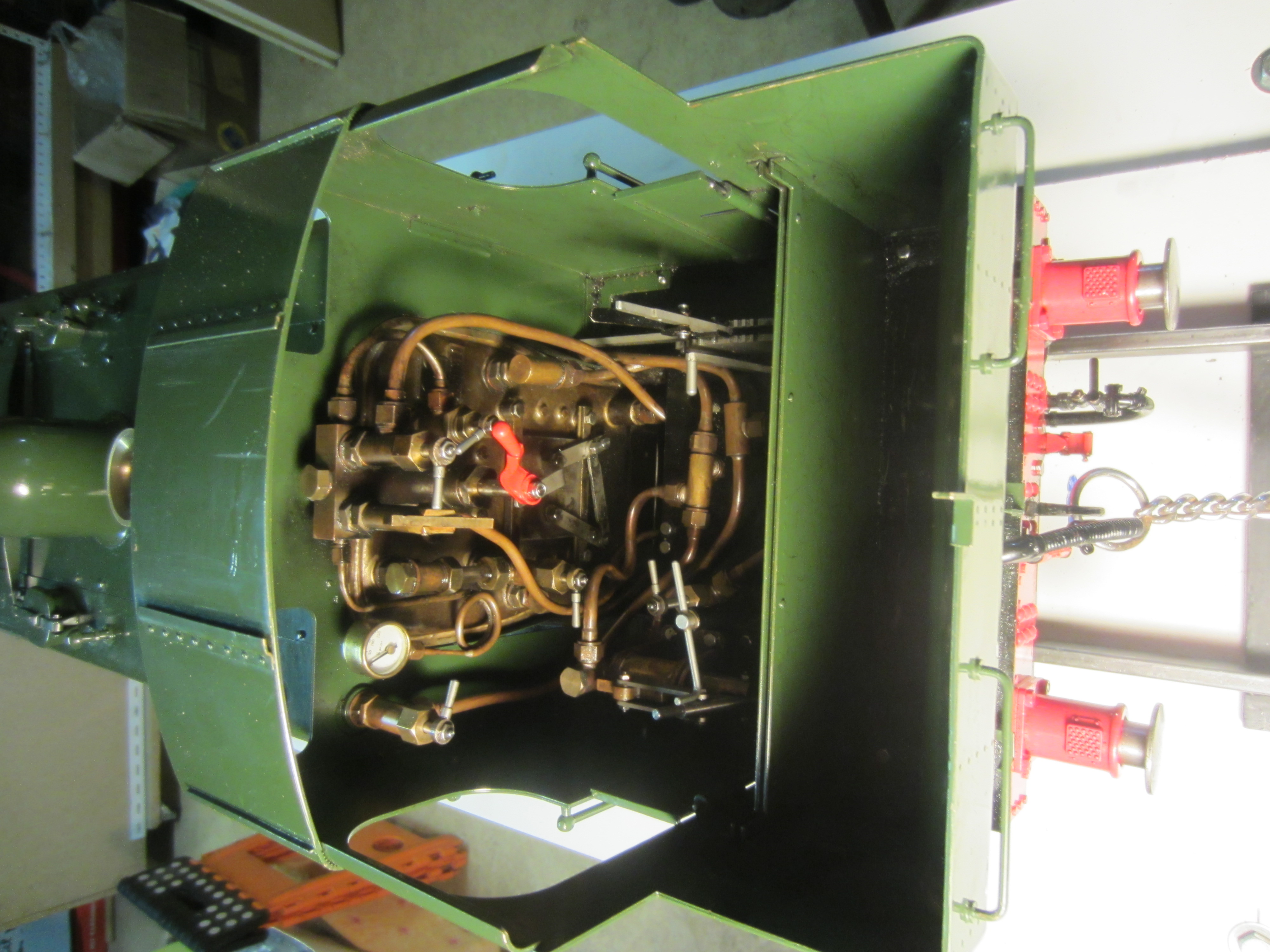 pour passer la tuyauterie de l'injecteurc'est trés difficile , les passages n'avaient pas été prévu....la solution est de mettre la loco sur le coté, mais ça pese 100 kilogs...l'ami J-C lABROT m'a conseille de lever par la chaudiere, et ça c'est fait facilement , j'ai la chance d'avoir une épouse qui me donne les mains et ne craint pas de tenir ,lever , pousser , ranger etc....