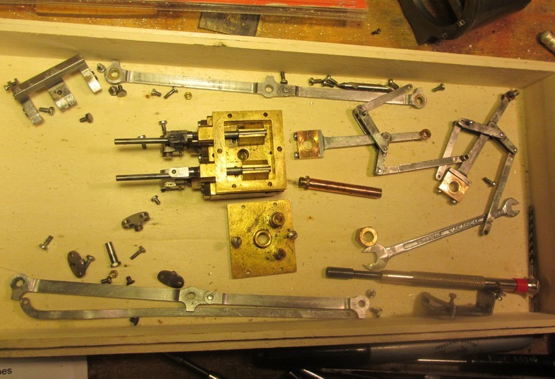 C’est un projet resté en plan pendant quelques années au stade de châssis et chaudière, pour cause de moteurs à 4T, pour ne pas laisser ces pièces rouiller dans leur boite, il faut que je la termine... Mais cette nouvelle loco est bien plus sophistiquée ; ici il y a suspension des axes, bielles d'accouplement articulées, 2 cylindres double effet entre les roues et embiellage radial de Joy, sans excentrique donc, qui prend le mouvement pour le tiroir sur la bielle principale par un système de biellettes et une coulisse pour le changement de marche. C'est amusant à regarder mais sur la loco finie on ne verra rien du tout, l'ensemble étant entre le châssis !