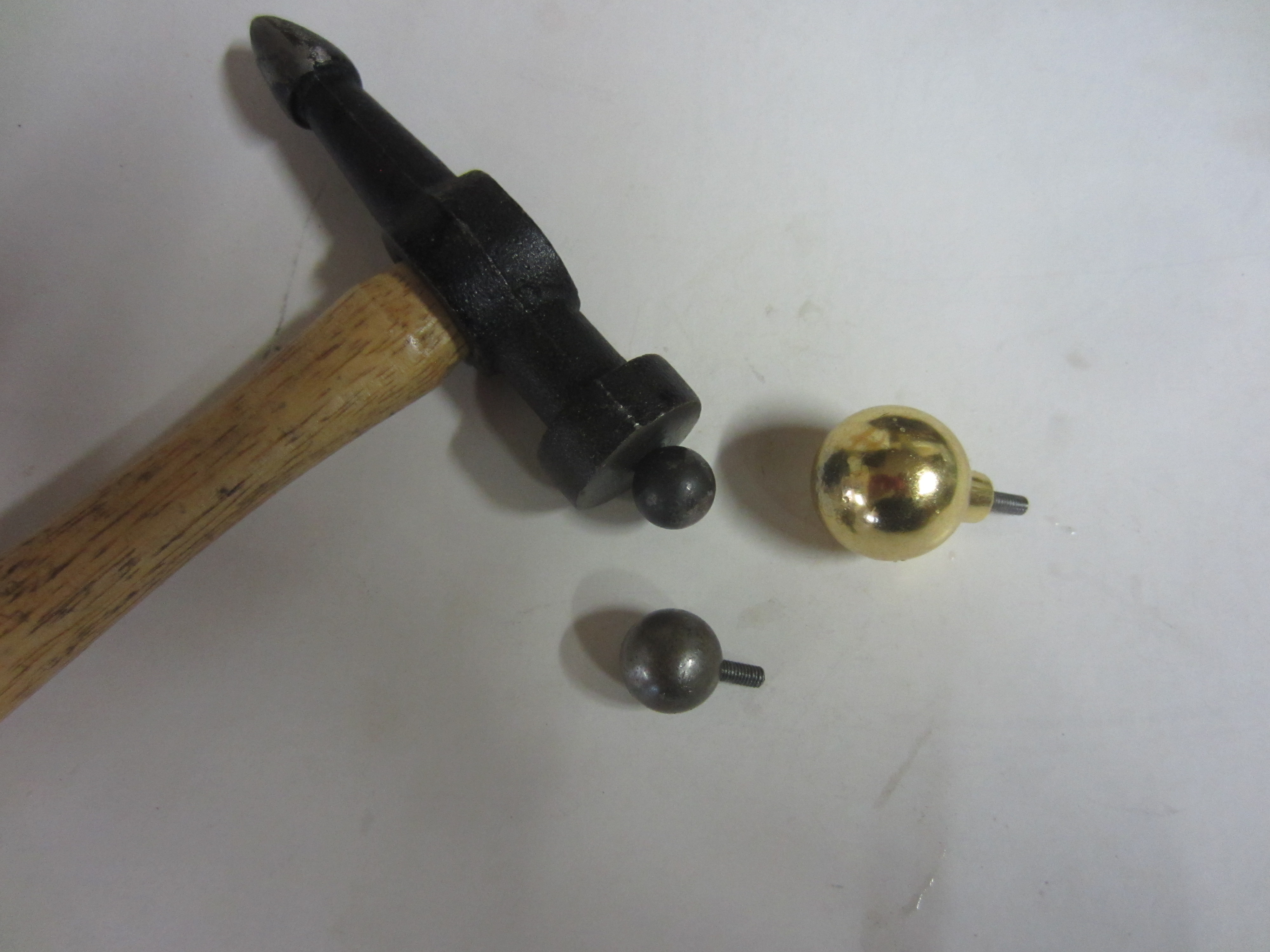 aussi j'ai modifié un marteau ordinaire avec 3 boules interchangeables (sur tige M4 ), ça marche bien , je vais meme faire une plus petite tete pour les cerclages cuivre de mes 2 domes de vapeur ....