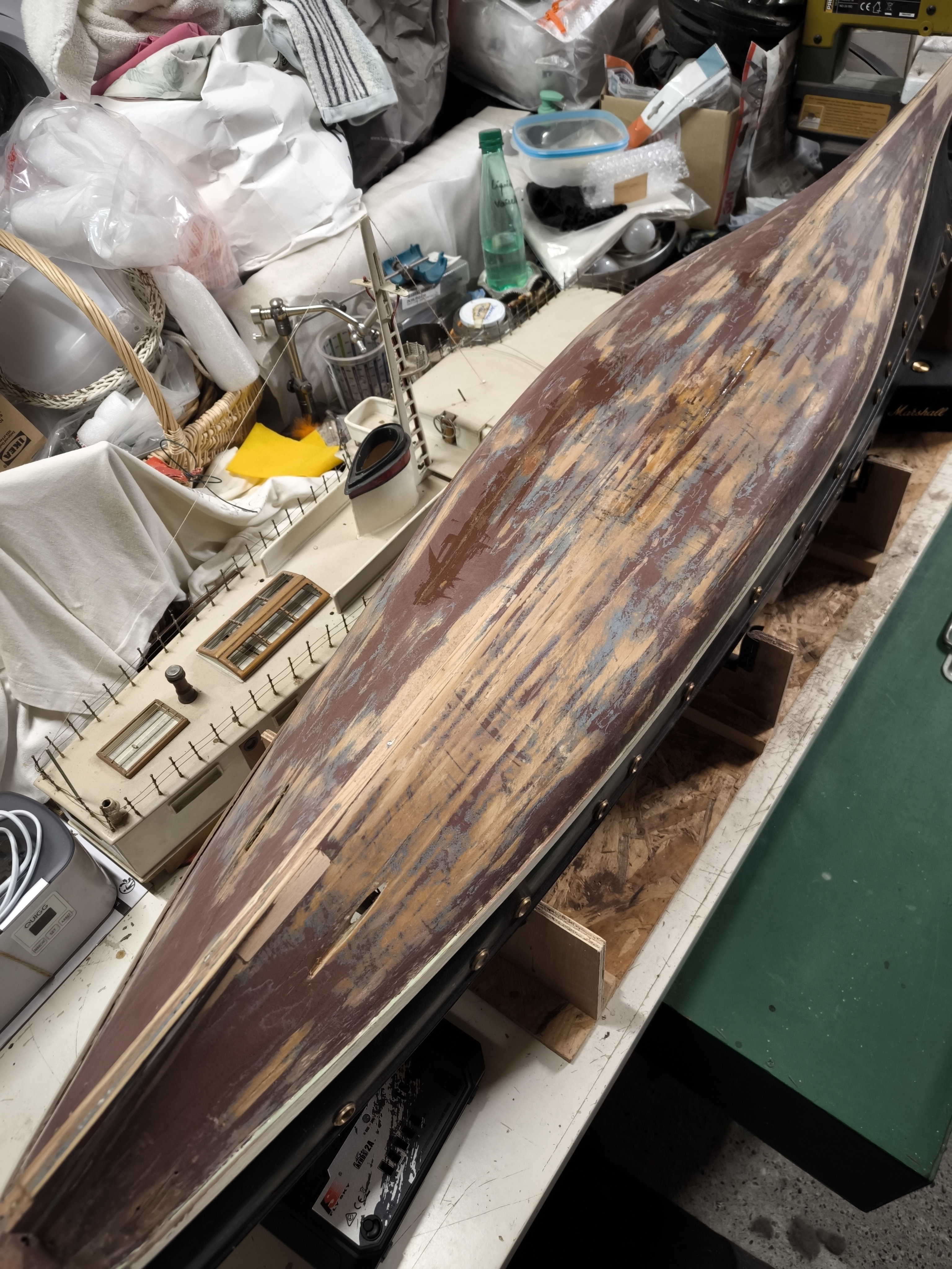 J'ai fait un essai pour boucher les fissures sur la coque en mettant de la sciure + de la résine 5 min (ça marche bien), à part ça, je vais essayer de mettre du décapant peinture sur bois pour voir si ça l'enlève bien.