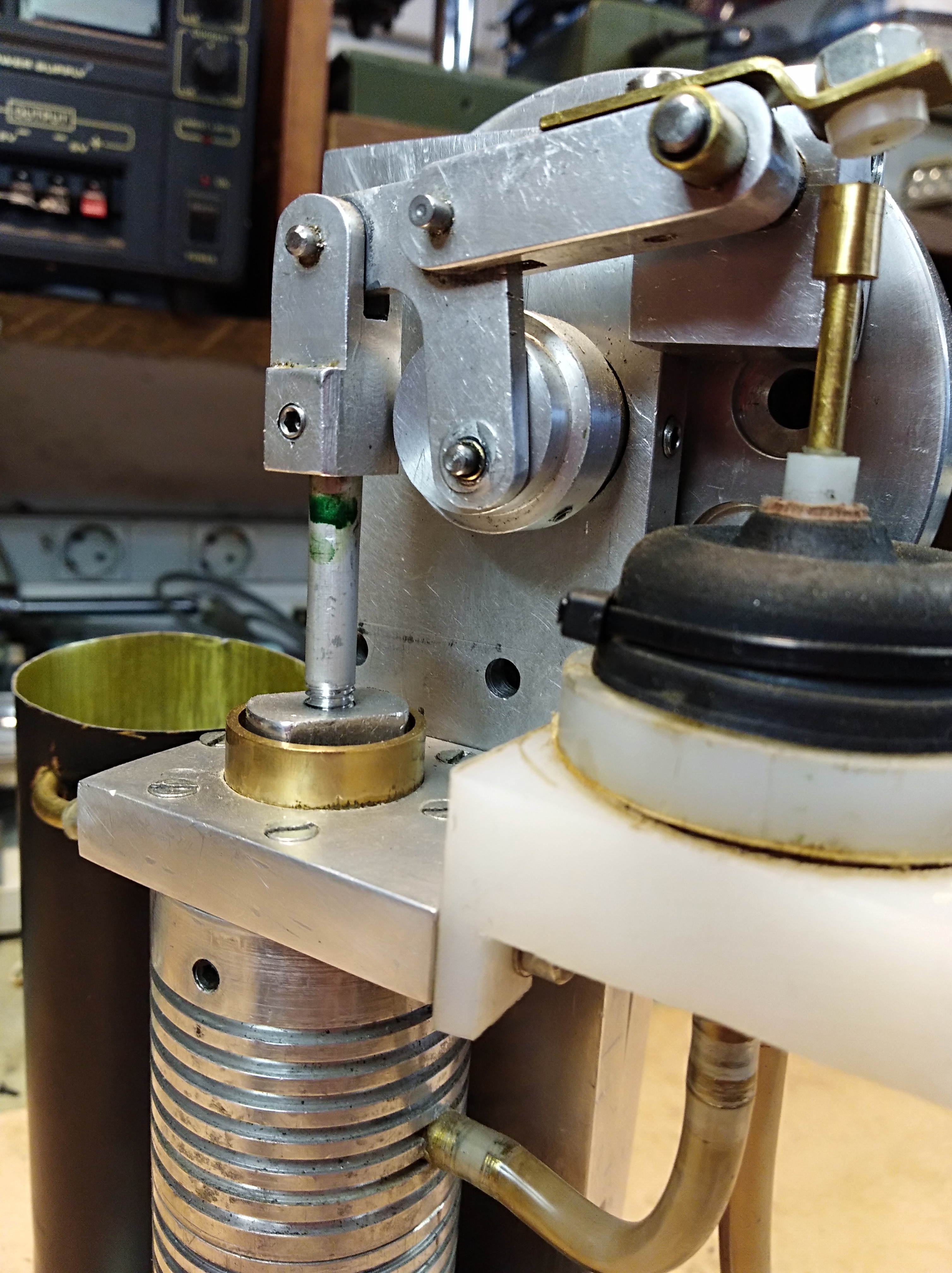 Le cylindre de 8mm en laiton qui est solidaire du piston principal forme avec le cylindre central de 8mm solidaire du déplaceur un ensemble piston cylindre qui réagit à la différence de pression entre la pression atmosphérique et la pression interne dans le moteur (le cylindre de 8mm coté piston est relié à l'air libre: (à voir au sommet de la tête du piston). Dans la phase de compression (le piston principal descend), le petit piston (8mm) pousse le déplaceur (1,2 atm > 1 atm) vers le haut. Par contre dans la phase de détente, le petit piston aspire le déplaceur vers le bas (0,8atm < 1atm). C'est par l'intermédiaire des 2 petits cylindres de 8 mm coulissants (et guidants) que le déphasage entre piston - déplaceur est effectué. Dans ce moteur je pense que l'on pourrait diminuer le diamètre du petit piston de 8 à 7mm pour emprunter moins d'énergie (de force) au moteur pour actionner le déplaceur (amélioration du déphasage et choc moins important).