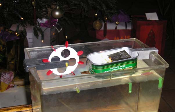 Et pourtant... Il y a quelques années Jeff Bindon (Afrique du Sud) m'a envoyé une "grande roue" que j'ai utilisée selon ses recommandations dans un aquarium pour animer un soir de Noël. Un moteur pop-pop faisait tourner la roue. Dans l'aquarium il y avait des petits bouts de pailles de bistrot en plastique de différentes couleurs. Densité du plastique voisine de celle de l'eau. Le brassage de l'eau faisait plonger et remonter ces "poissons". La "grande roue" tournait lentement et régulièrement... mais le brassage de l'eau était probablement surtout dû directement au fonctionnement du moteur.PopLouis a écrit :A l'origine, il s'agissait d'une propulsion pop-pop classique, et j'avais dirigé les tuyères du moteur sur les aubes du bas, immergées, en espérant faire tourner les roues. Je n'ai jamais réussi par ce moyen, la puissance des jets étant trop faible, et aussi à cause de l'aspiration de l'eau par ces tuyères, annulant presque l'effet de la poussée...