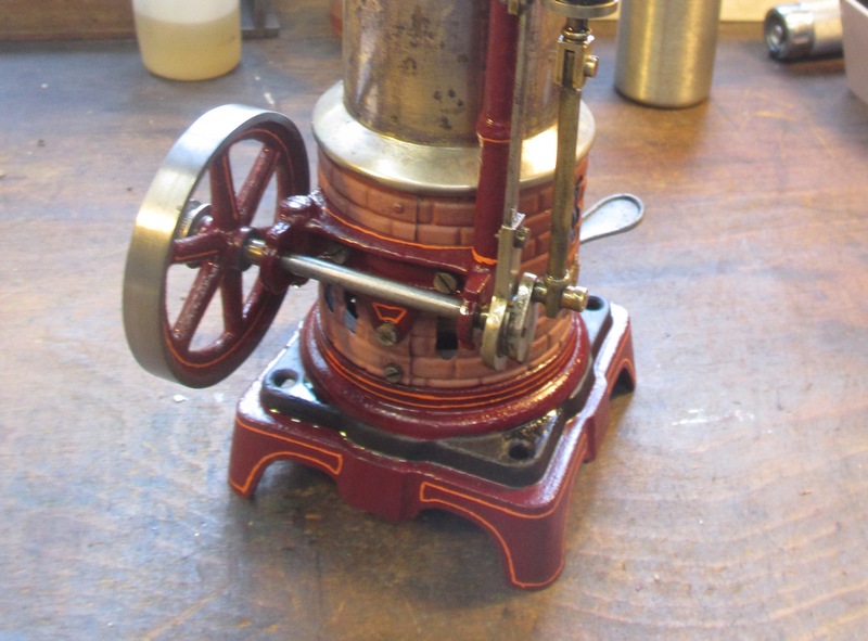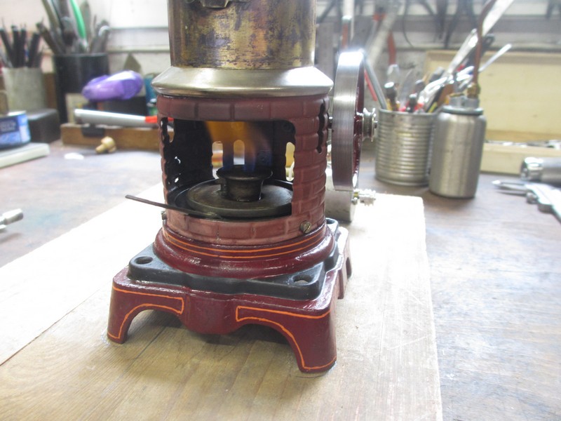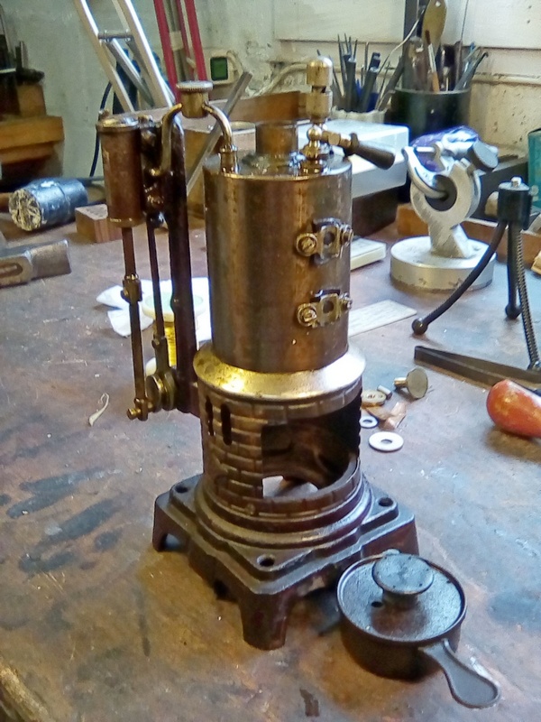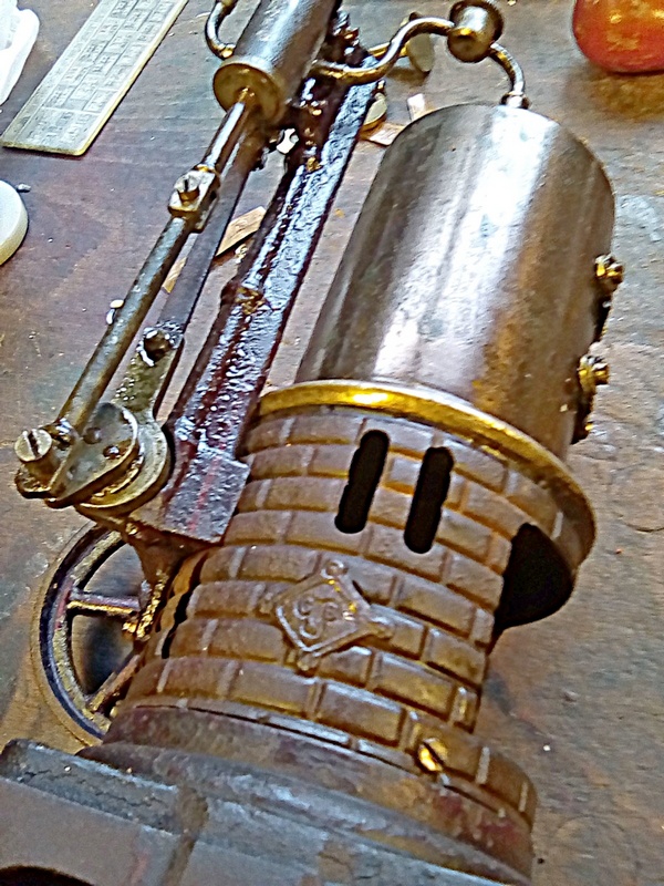 Tout fonctionne, la fabrication est plutôt soignée, socle, bâti et volant en fonte, cylindre et son tiroir « externe » a slip excentrique. Mais la peinture a souffert, à peine visible, mais par contre la fameuse coloration « acier bleui » très courante sur ces chaudières est encore récupérable, juste un peu rouillée par endroit.