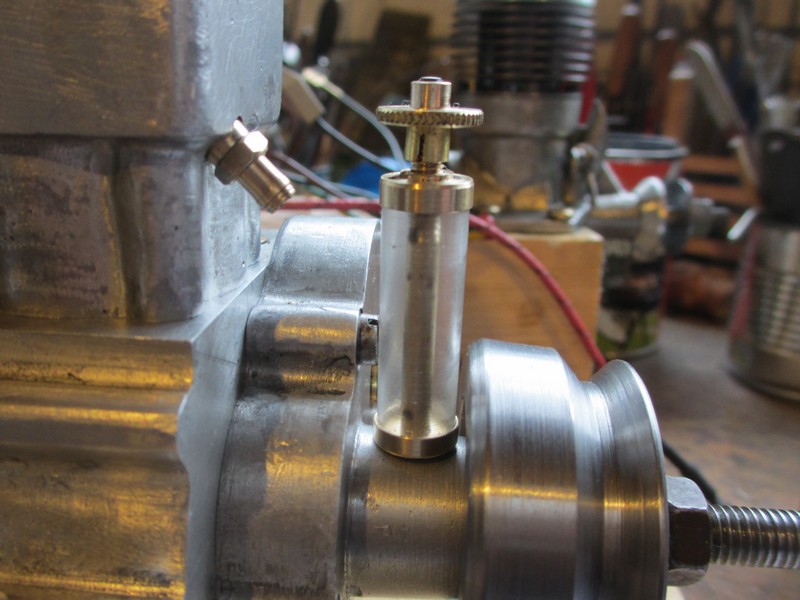 hier et aujourd'hui, c'est seulement un petit huileur à pointeau, avec le niveau visible en plexiglas, à visser sur le palier pour huiler le vilebrequin et les pignons. Le maneton la bielle et les cames sont huilés dans le carter principal par barbotage.