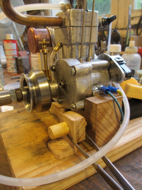 Le moteur 4T en cours est mon premier à avoir un refroidissement par eau, les premiers essais avec un réservoir et des tuyaux montre que ce refroidissement est très efficace, l'eau se réchauffe ,(disons : 1 l d'eau passe de 20° à 35° en 8-10 min) et le cylindre et la culasse restent à une température "touchable" .
