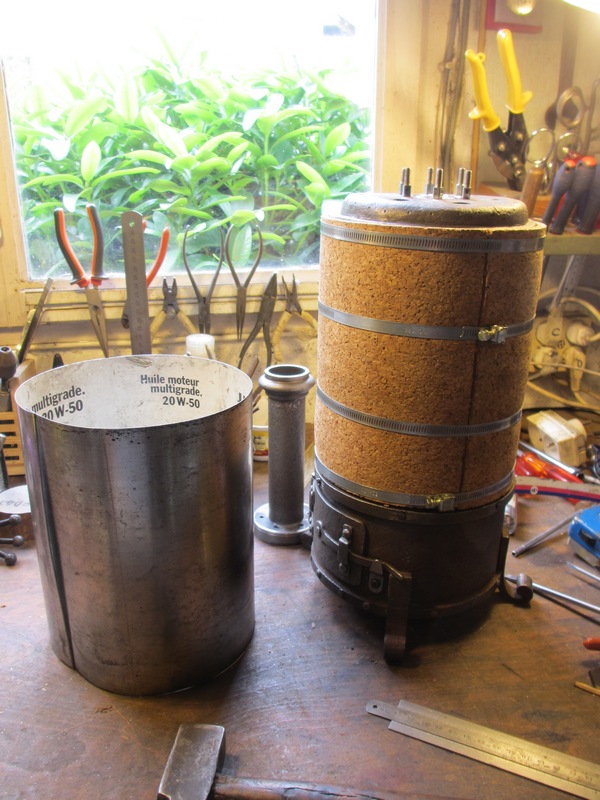 Aujourd'hui, isolation par une couche de liège 6mm, et recouvert d'une tôle mince. Le bleuissage à la chaleur est très facile sur des petites pièces mais obtenir une teinte homogène sur une surface pareille, je ne le sens pas...donc je vais être obligé de peindre, noir ferronnerie, je mettrais des bandes laiton pour décorer un peu quand même!