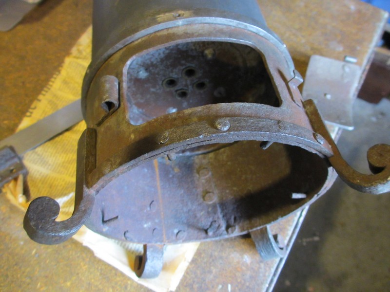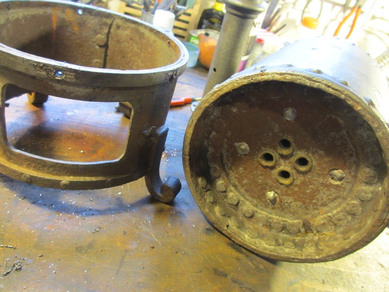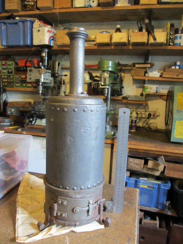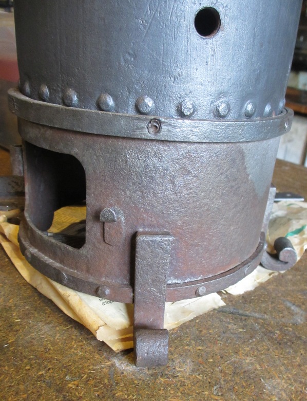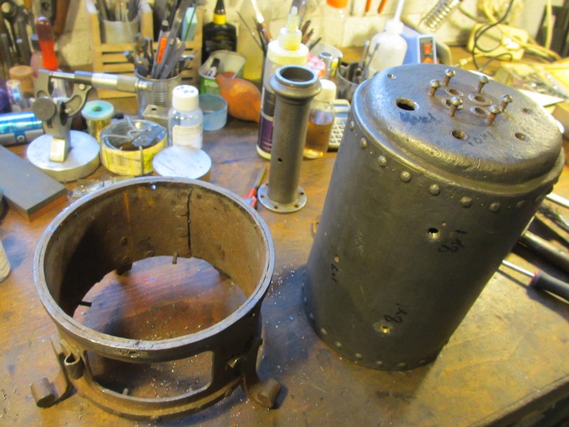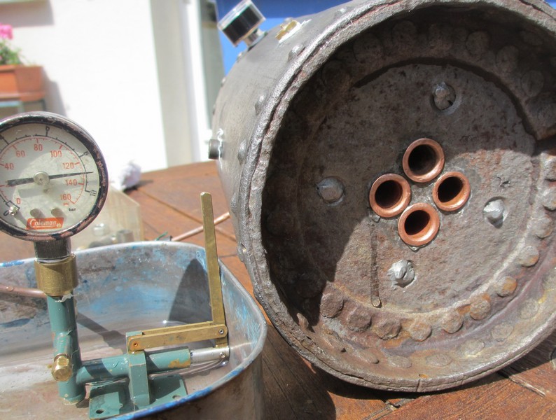 C’est un tube acier de 160 mm de dia, de 6 mm d’épaisseur (c’est lourd !) et de 220 de haut, avec 2 fonds emboutis et rivetés au tube par une rangée de rivets, et traversée par 4 petits tubes à fumée, de dia 8, serrés au milieu, qui ont l’air ridiculement petits pour cette imposante chaudière. Il n'y a pas de boîte à fumée.