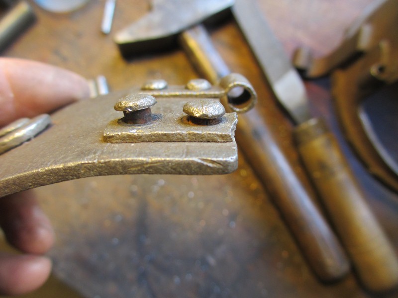 Il fallait démonter l’ancienne, enlever les rivets proprement, former une charnière dans un bout de tôle pour l’axe de 6mm, faire des rivets dans des gros clous de charpente, et riveter la nouvelle charnière à la place de l’ancienne. Pour écraser les « rivets » j’ai du taper vraiment fort…