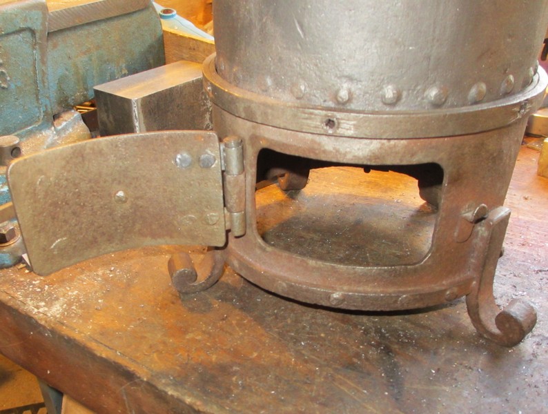 Cette chaudière est simplement enfoncée sur un socle en acier également, posé sur 4 pieds joliment forgés, avec une belle porte de foyer (cassée, mais que je viens de réparer), et plein de place pour un foyer charbon, gaz, bois, uranium enrichi ou tout autre combustible connu et inconnu, capable de chauffer cette masse de métal.