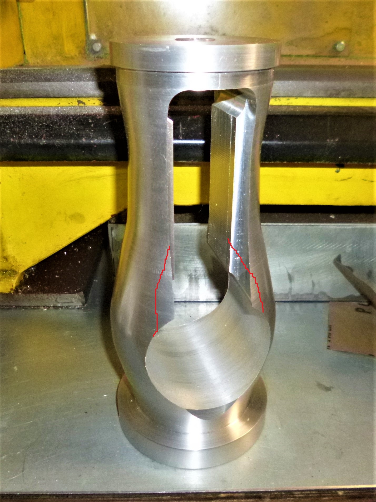si tu as une fraise assez longue pour enlever la partie marquée en rouge, sinon avec la tête d'alésage, mais de toute façon, il faut remonter la pièce et bien noter les coordonnées pour faire les 2 côtés pareils !