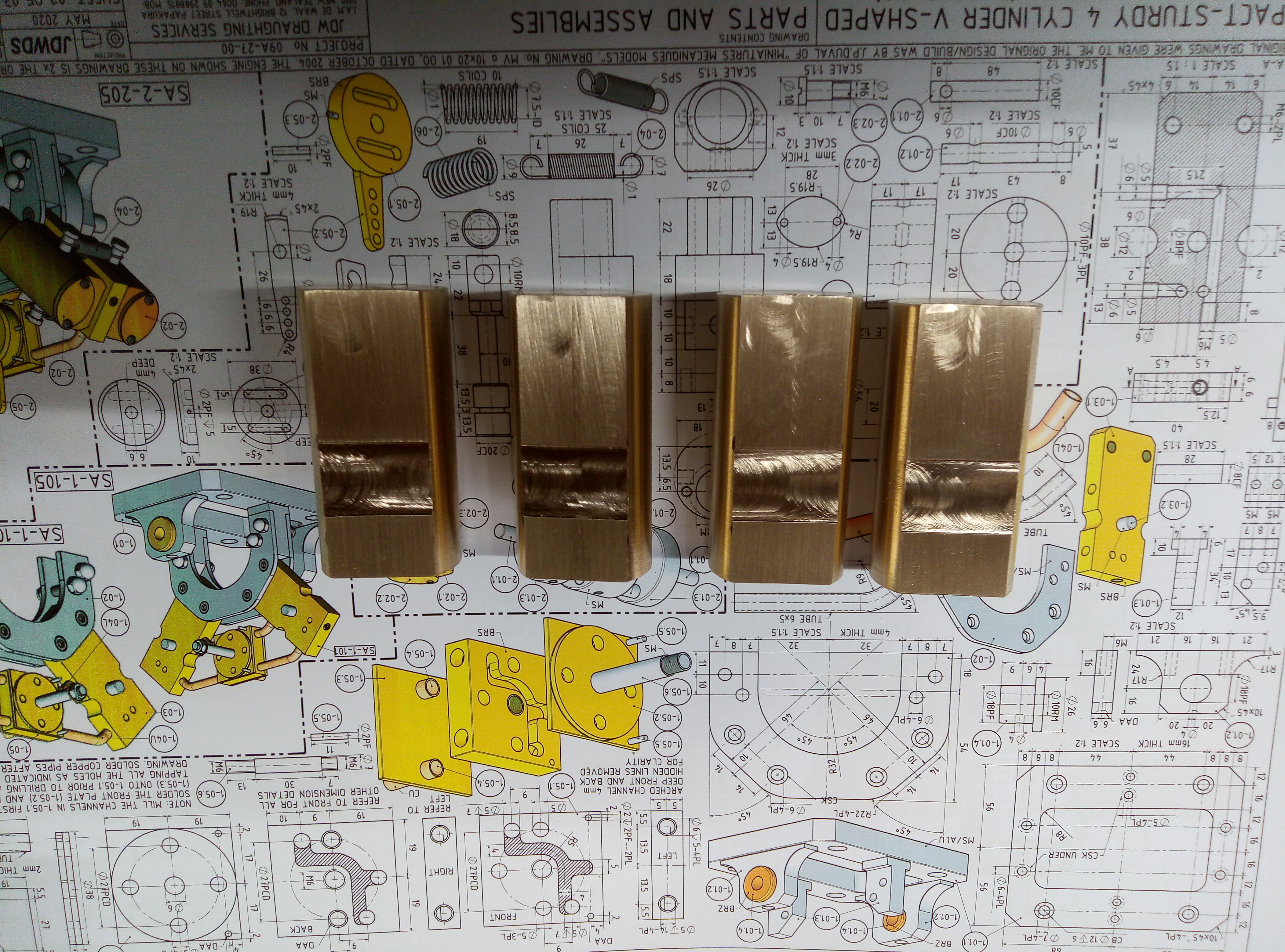 J'ai commencé la fabrication d'une machine V4 à cylindres oscillants simple effet de 13cc. Le plan est un dérivé agrandit du MV10x20 de JP Duval (devenu 13x26). Les pistons raccourcis sont modifiés par des coupelles téflon, j'ai ajouté un guidage du bas des tiges. L' inversion se fera par un tiroir cylidrique à la place du rotatif. (Le plan J. DeWaal est une machine 20x40)