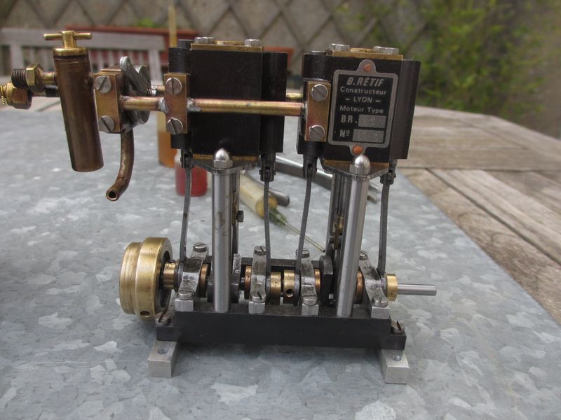 Le moteur vapeur est un bicylindre double effet type BR63 N°13 (alésage 14 course 14, soit 8.6cm3) à tiroirs cylindriques et marche réversible par un levier inverseur pour radiocommande.