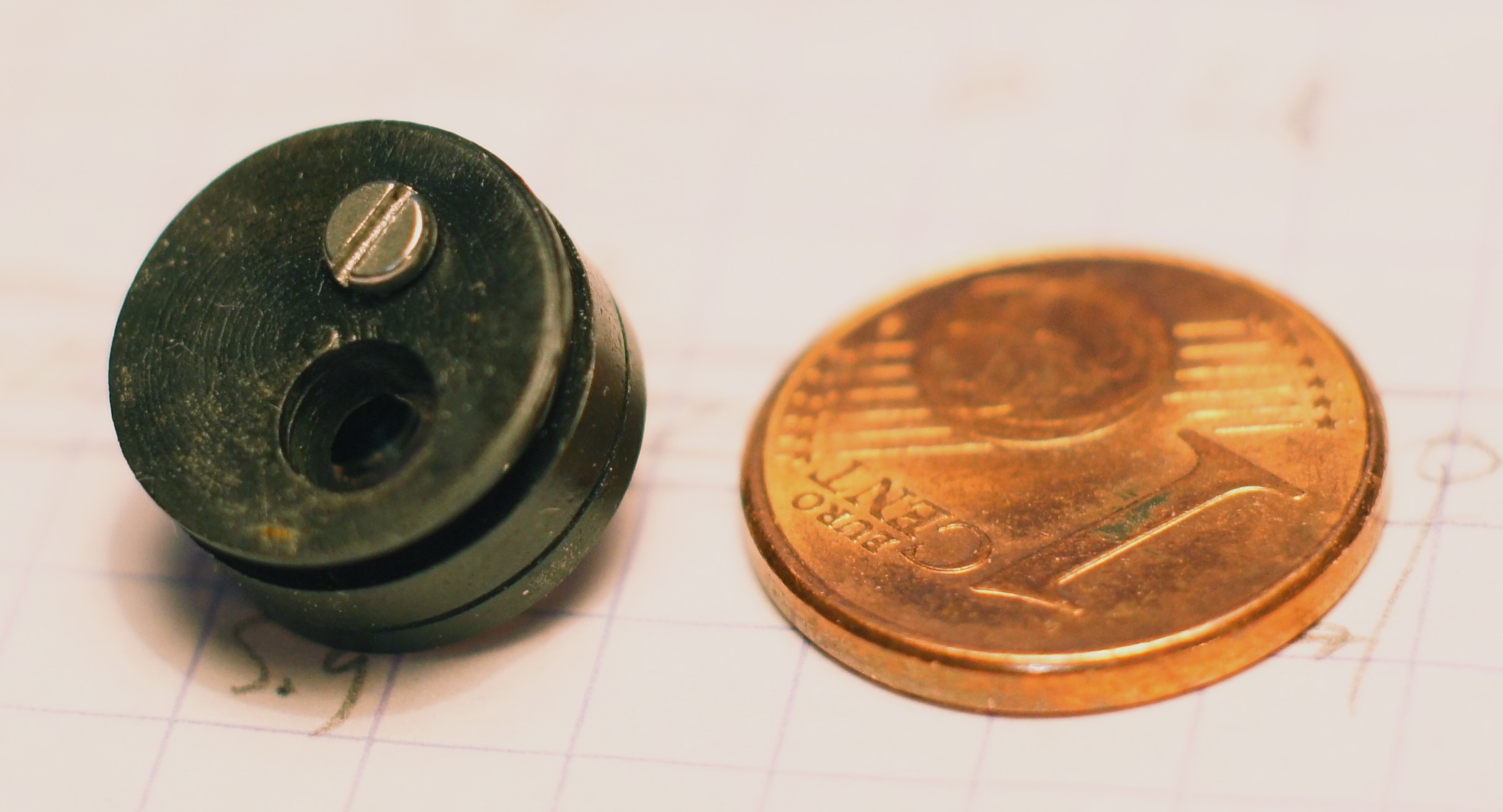 Sur le fond du cylindre une tige filetée laiton M3, épaulée/filetée M2,5, à améliorer.