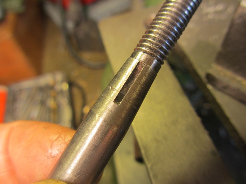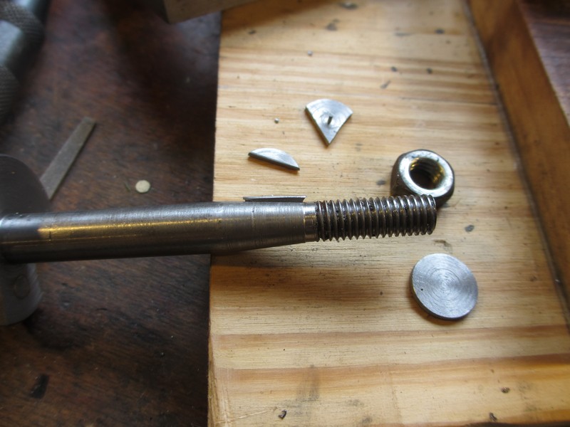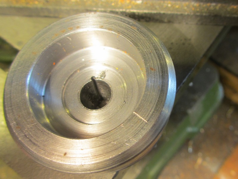 la taille de la rainure sur l'arbre est très facile, juste un petit coup de fraise disque tangentiel, avec une fraise disque "maison" d'une taille idoine que j'avais en stock. C'est là sans doute ou réside l'intérêt de cette clavette, il faut 2 min pour cette rainure... Par contre faire une rainure de hauteur constante sur le volant n'est pas facile à cause de la conicité de l'alésage; j'ai du faire un perçage avec le volant incliné entre l'alésage et un martyr conique pour ébaucher cette rainure, qui est finie à la main à la lime aiguille. et la clavette elle-même est simplement coupée dans un disque tronçonnée en acier dur.