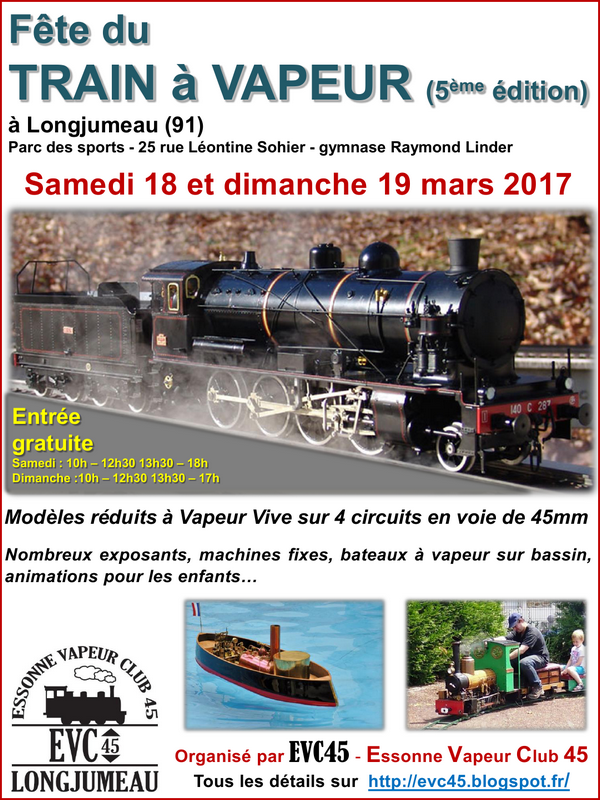 Voila l'affiche pour la fête de la vapeur organisée par mon club, EVC45 (Essonne vapeur club) les 18 et 19 mars 2017...