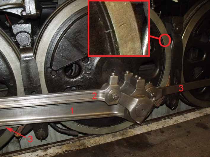 Je n'ai pas de photos des pièces défectueuses, mais voilà l'explication de l'arrêt: L'axe 1 est sorti (perte goupille), les bielles 2 et 3 se sont percutées et pliées, résultat plus de graissage par le graisseur Nathan (au dessus). Remise en route à 5km/h avec un personnel qui faisait fonctionner le graisseur manuellement.