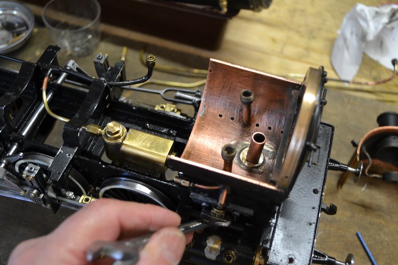 il faut maintenant remonter la partie inférieure de la boite à fumée sur la colonne d'échappement et relier les conduits de graissage des cylindres