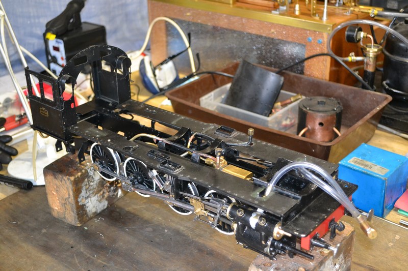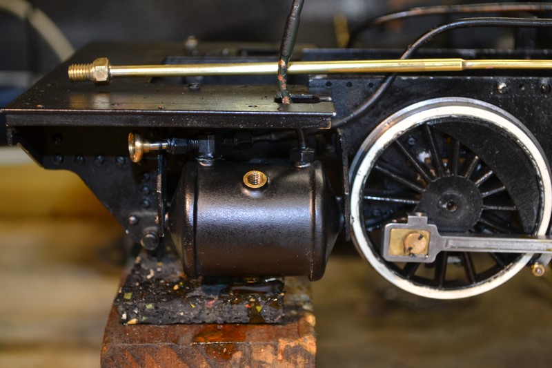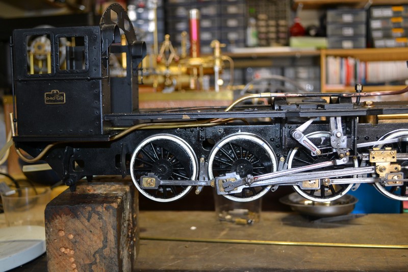 l'alimentation de la chaudière par la pompe à eau du tender nécessite un exercice de plomberie assez tortueux car les passages possibles sont rares compte tenu du foyer crampton qui occupe tout l'espace entre les longerons.