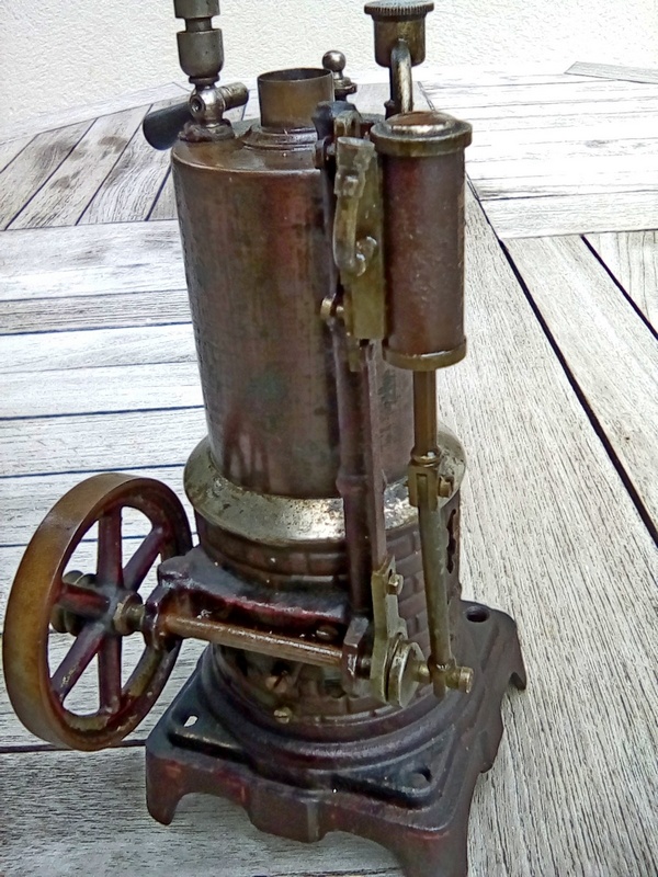 Tout fonctionne, la fabrication est plutôt soignée, socle, bâti et volant en fonte, cylindre et son tiroir « externe » a slip excentrique. Mais la peinture a souffert, à peine visible, mais par contre la fameuse coloration « acier bleui » très courante sur ces chaudières est encore récupérable, juste un peu rouillée par endroit.