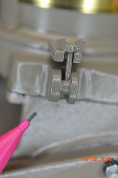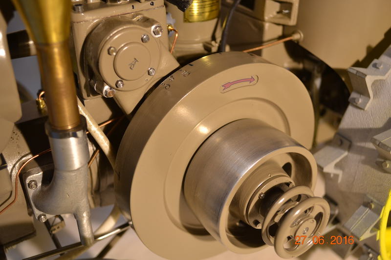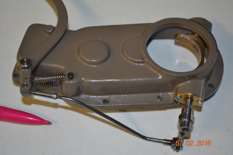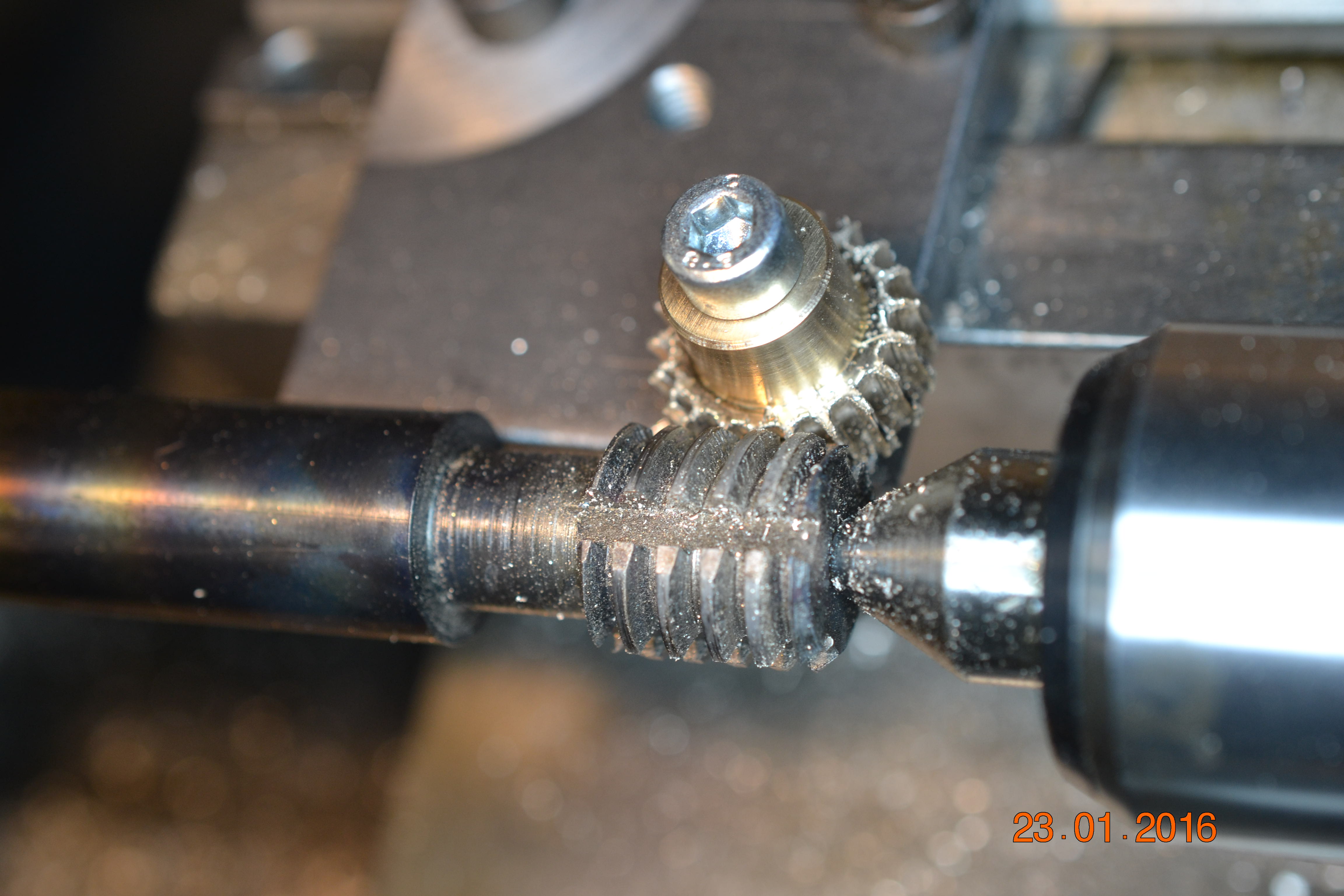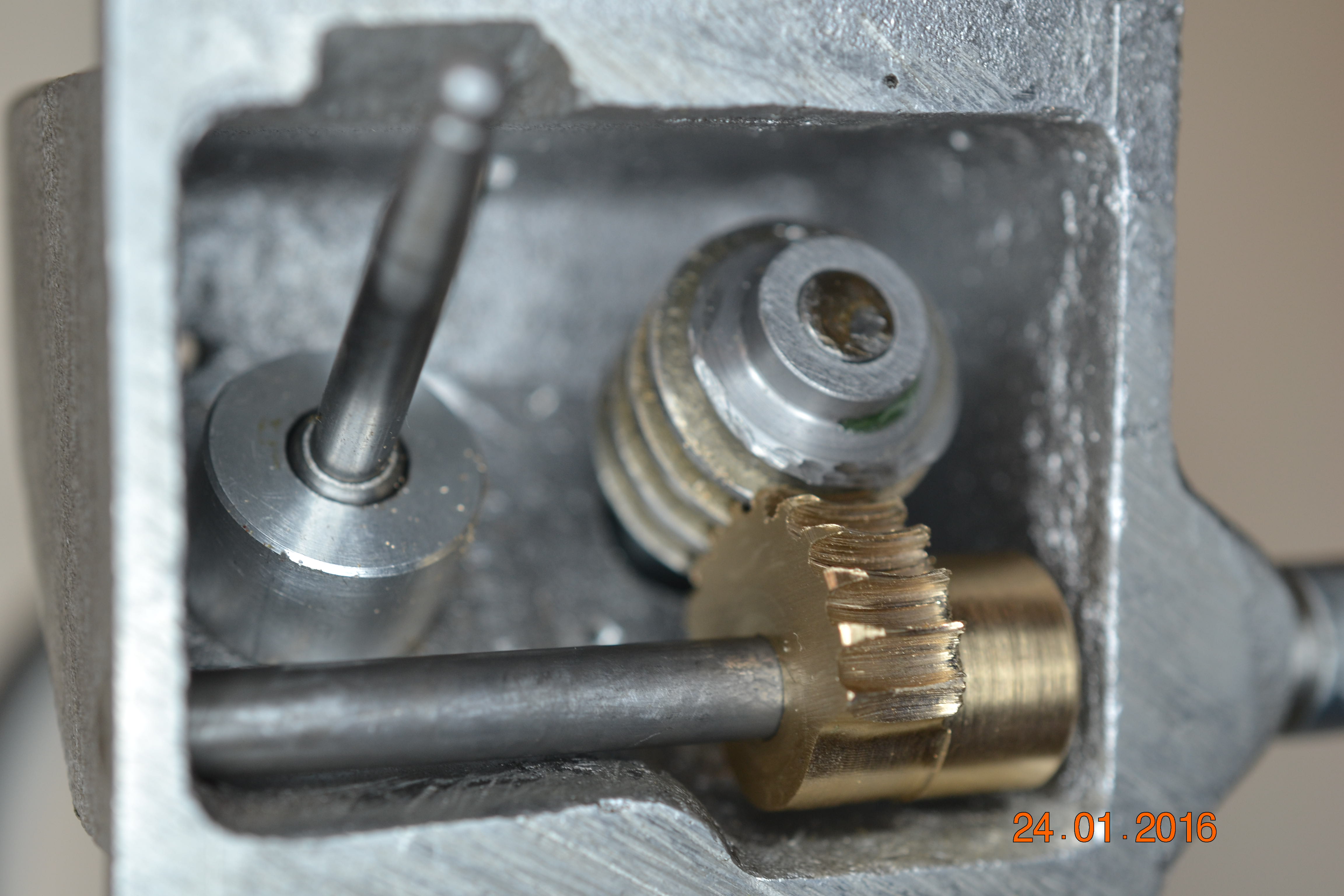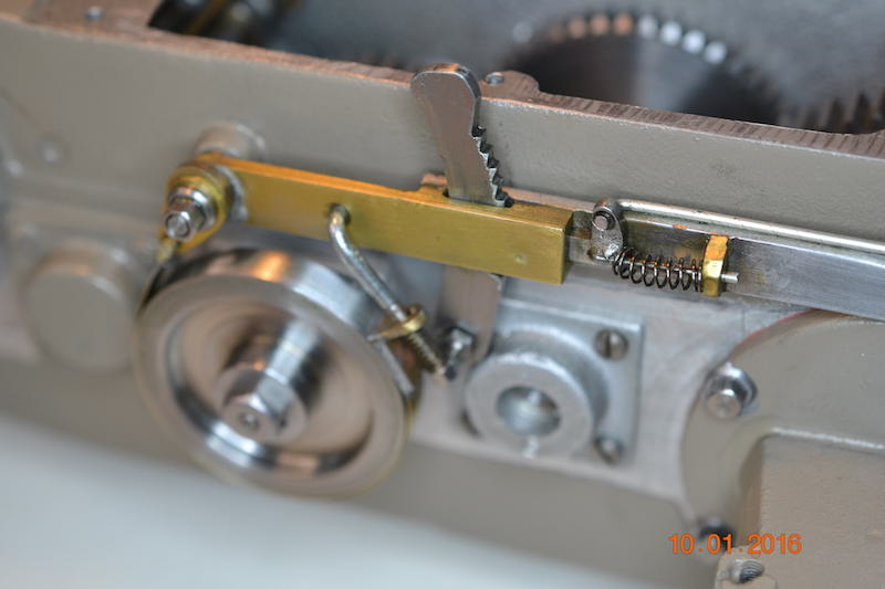 (Ph213) montage de la vis et de la crémaillère dont un secteur a été préalablement fraisé. La tige visible sur le côté gauche est le levier de changement de vitesse.