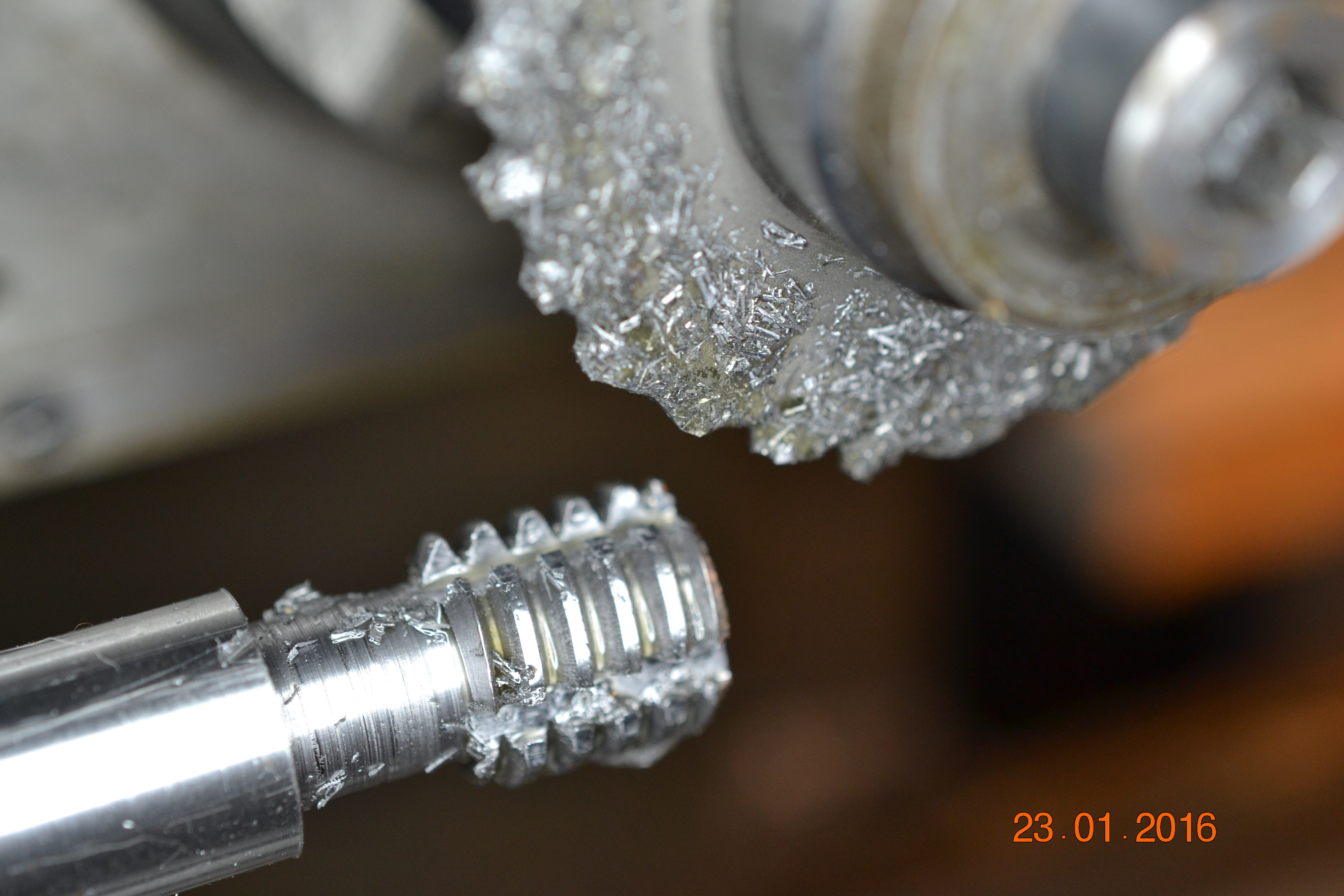 (Ph204 à 207) usinage de ladite vis. Une partie sera la vis à proprement parler et l’autre partie sera l’outil pour usiner la crémaillère. Pour plus de précision, j’ai usiné les deux en une fois.