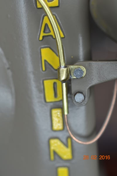 (Ph223 à 226) commutateur d’éclairage. Canalisation du câble électrique pour les phare avant. Le tube en laiton cintré à 1.5mm de diamètre. (Ph227) montage à blank.