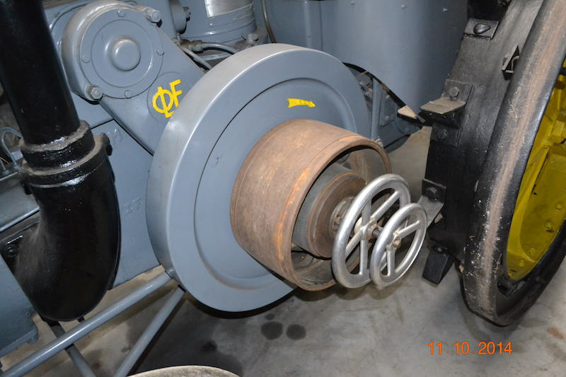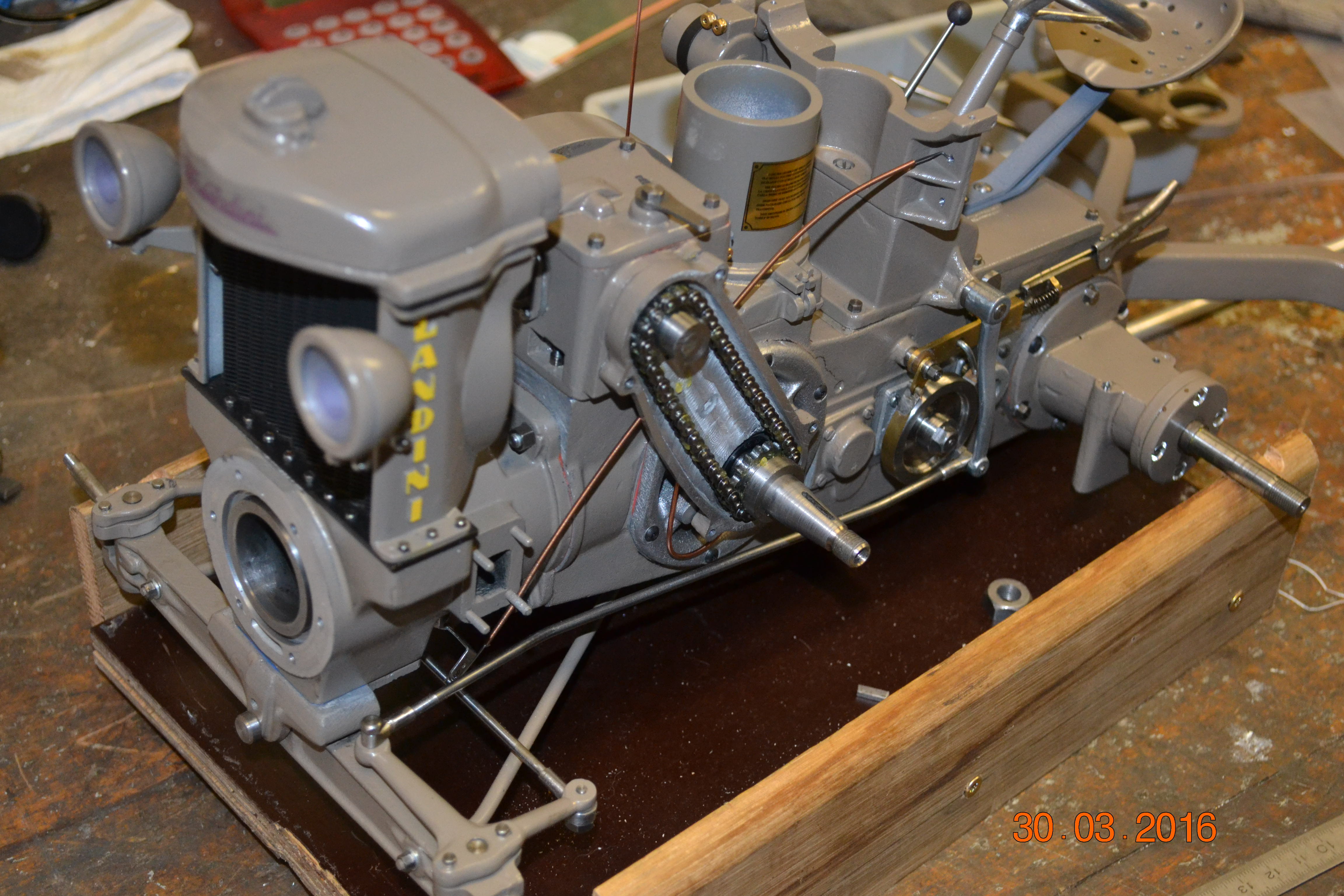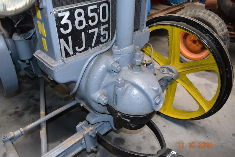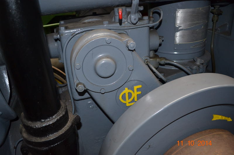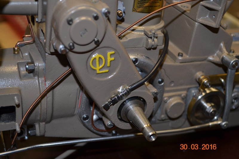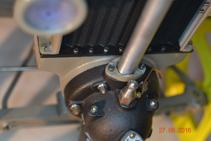 (Ph201) fixation de l’essieu avant sur pivot. On devine le carburateur juste à l’arrière.