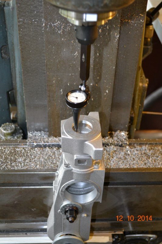 (Ph 23 & 24) Ce montage est celui qui me semble le plus rationnel pour respecter l’orthogonalité des axes, ainsi que la distance entre les deux axes. Dans le cas présent, je me sers du voile de vilebrequin pour la MàZ. Dès que la pièce est parfaitement centrée, on peut excentrer. Ensuite aléser par palier successif pour finir avec une fraise en bout de série courte, ceci pour limiter la flexion de l’outil. La dernière passe doit être de maximum 0.5mm, ceci pour éviter les vibrations et/ou torsion de la pièce. Les contraintes inutiles vont diminuer la précision d’usinage. La cote finale de cet alésage n’as aucune importance, vu que la dimension du maneton seras adaptée en conséquence. Il peut y avoir une erreur au niveau de l’entr’axe, cela à peu d’importance qu’il y a un dixième de plus ou de moins. La cylindrée finale variera de quelques fractions de cc. Toutefois, l’erreur dois être rigoureusement la même sur les deux flasques.