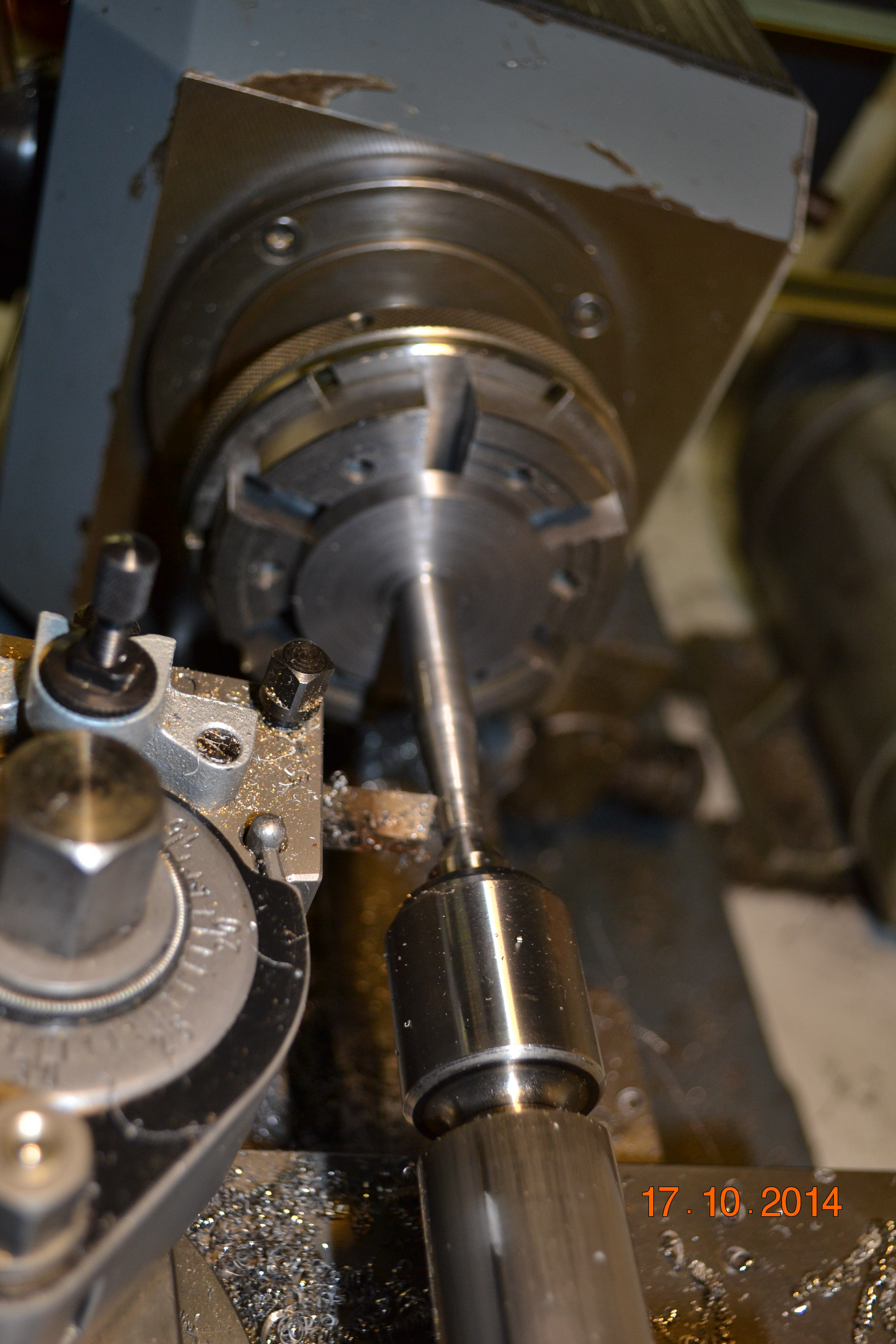 (Ph 21) Usinage sur le tour du filet de fixation du volant. Le fait d’exécuter cela à la machine garanti le parfait centrage de la vis.