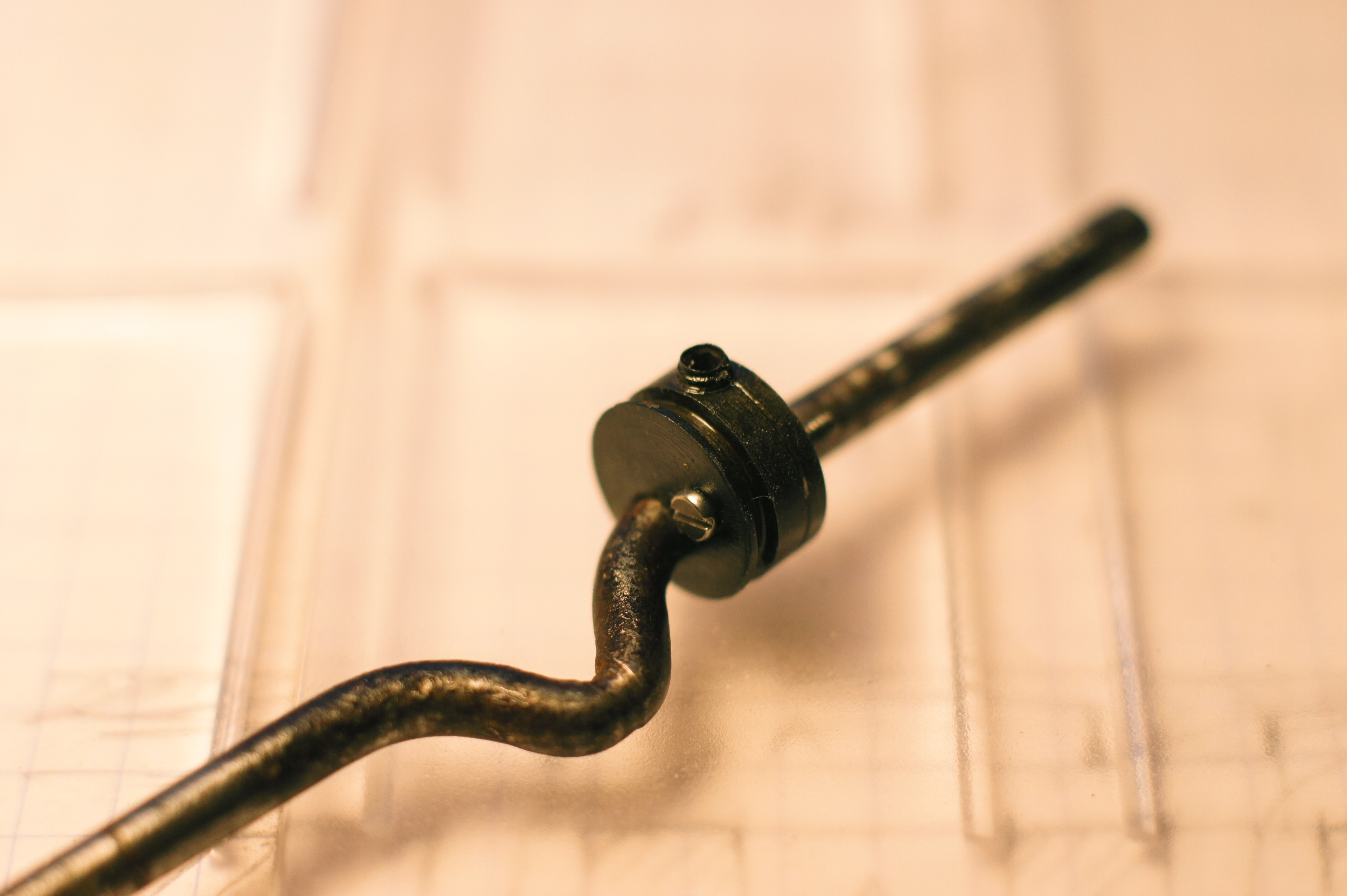 Pas trop content du nettoyage, cela a provoqué des irrégularités dans le noircissement "armurerie" Autre erreur de débutant : à force de regarder photos "macro" et plan A4 j'ai tendance à oublier la vraie grandeur... problème quand j'arrive à l'établi. A au fait acier doux pour l'excentrique et de récup pour le tasseau. Pas d'âne ferré chez moi, ils ont tous des chaussures