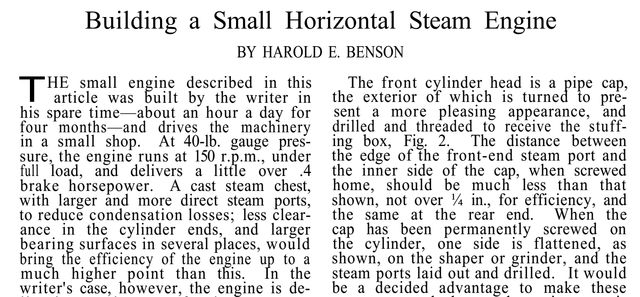 En effet, ces dimensions mal calculées sont également présentes dans l'article original de Harold Benson dans Popular Mechanics de juin 1923. de même que les lumières rondes, et la cavité du tiroir également en arc de cercle, ce qui est la plus mauvaise façon d'ouvrir et de refermer admission et échappement, en plus de la quasi absence de recouvrement. Surtout sur un moteur de cette taille, il est bien évident que des lumières rectangulaires s'imposent, ainsi qu' un tiroir modifié, avec des pattes de 8 à 10 mm de large, une cavité d'échappement rectangulaire sans recouvrement, moyennant quoi, je garantis des performances grandement meilleures.
