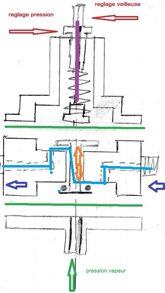 Le gaz suis le trajet en bleu, lorsque la pression de vapeur atteint la valeur déterminée par la contrainte du ressort, la membrane coté vapeur pousse le clapet vers le haut qui se ferme, mais, et c'est là l'astuce, la vis en mauve sur le schéma limite la fermeture du clapet en laissant une légère fuite.